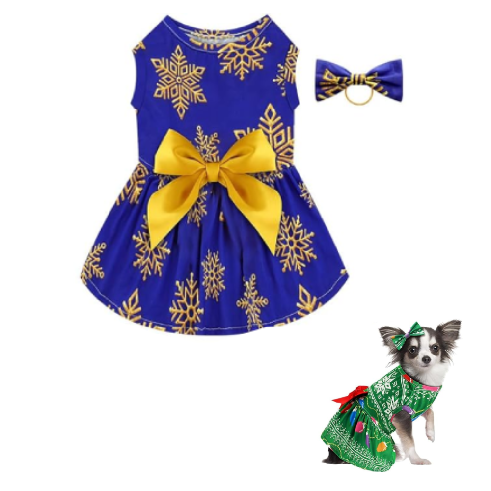 • Nuevos vestidos de navidad con lazos para temporada de fin de año cuenta con un patrón de  hasta un copo de nieve festivo y una casa de Navidad clásica. El diseño también incorpora un adorable lazo en la parte posterior de cada atuendo, amplificando el encanto de tu mascota; la ropa para perro está diseñada con un puente, y el abdomen tiene una banda elástica, que se adapta al abdomen del perro, y es conveniente para que el perro lo use y lo quite y vaya el baño.